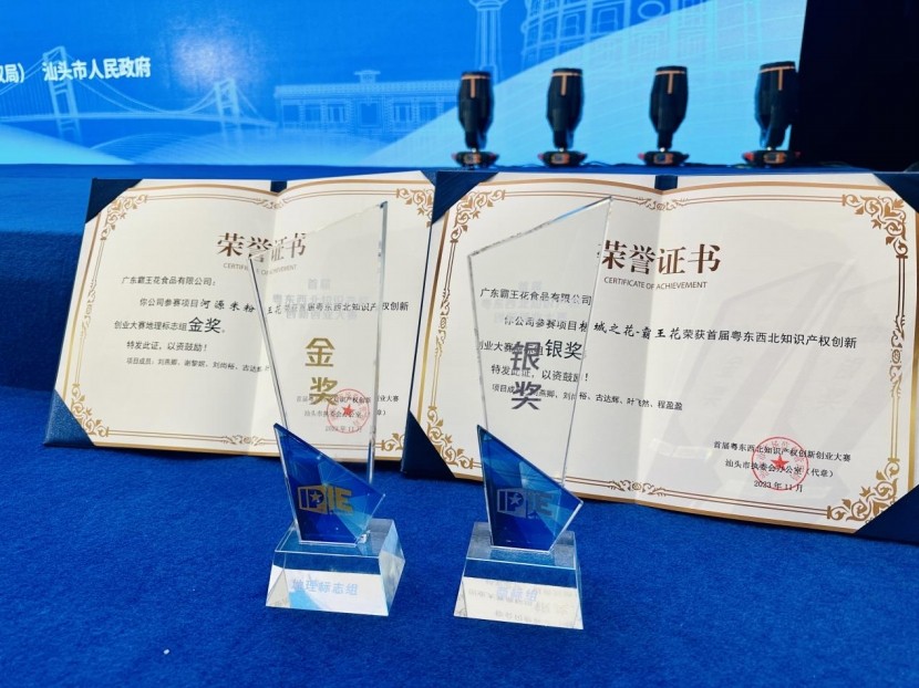 12月11日下午,首屆粵東西北知識產權創新創業大賽(以下簡稱“粵創賽”)頒獎儀式在汕頭舉行。廣東省人民政府副省長、黨組成員林濤,國家知識產權局知識產權運用促進司二級巡視員馬鴻雅,廣東省人民政府副秘書長孫哲,廣東省市場監督管理局黨組書記、局長劉光明,汕頭市委副書記、市長曾風保以及國家知識產權局、廣東省人民政府、廣東省市場監督管理局、粵東西北各地市人民政府等相關部門領導出席活動。廣東霸王花集團董事長朱日楊、黨委書記兼副總裁陳駿良作為項目獲獎單位代表受邀參加。
